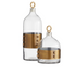 Over-scaled decanters of clear leaded glass are encircled with bold studded cuffs of antique brass. Topped with circular stoppers, this growler-shaped duo will lend an industrial edge to any bar.