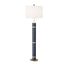 Topstitched leather and antique brass interact impactfully on the cylindrical base of this bold yet understated lamp. Accented with polished cuff details, the Yumi is topped with a drum shade of white linen. Finished with a clear cord and three-way rotary stitch.